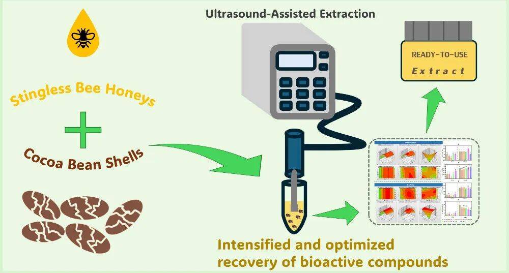 一项发表于(ACS Sustainable Chemistry & Engineering)的研究,开发了一种利用超声波技术从可可壳中提取生物活性化合物并与本土蜜蜂蜂蜜结合的新型功能性食品。该产品富含可可碱、及酚类抗氧化剂,兼具营养与风味价值,可单独食用或用于食品、化妆品配方。。该工艺无需合成溶剂,符合绿色化学原则。经 Path2Green 软件评估获得 +0.118 的可持续性评分。实验表明,蜂蜜的含水量和粘度对提取效率有显著影响,其中来自巴西曼达瓜曼的蜂蜜因性质适中被用于工艺优化。目前,团队正与学校创新机构合作,寻求商业伙伴以推动专利技术产业化。(巴西圣保罗州科研资助基金会)