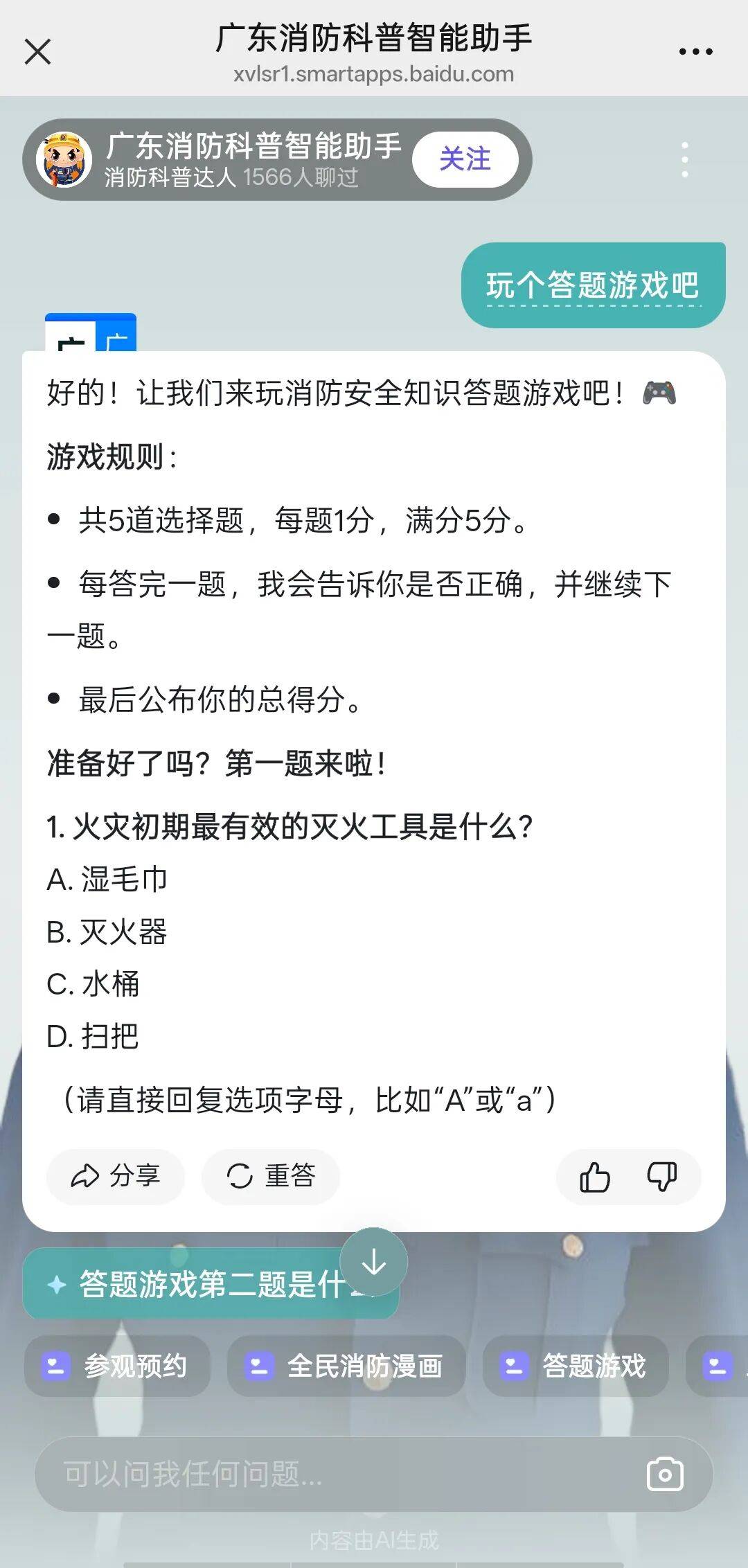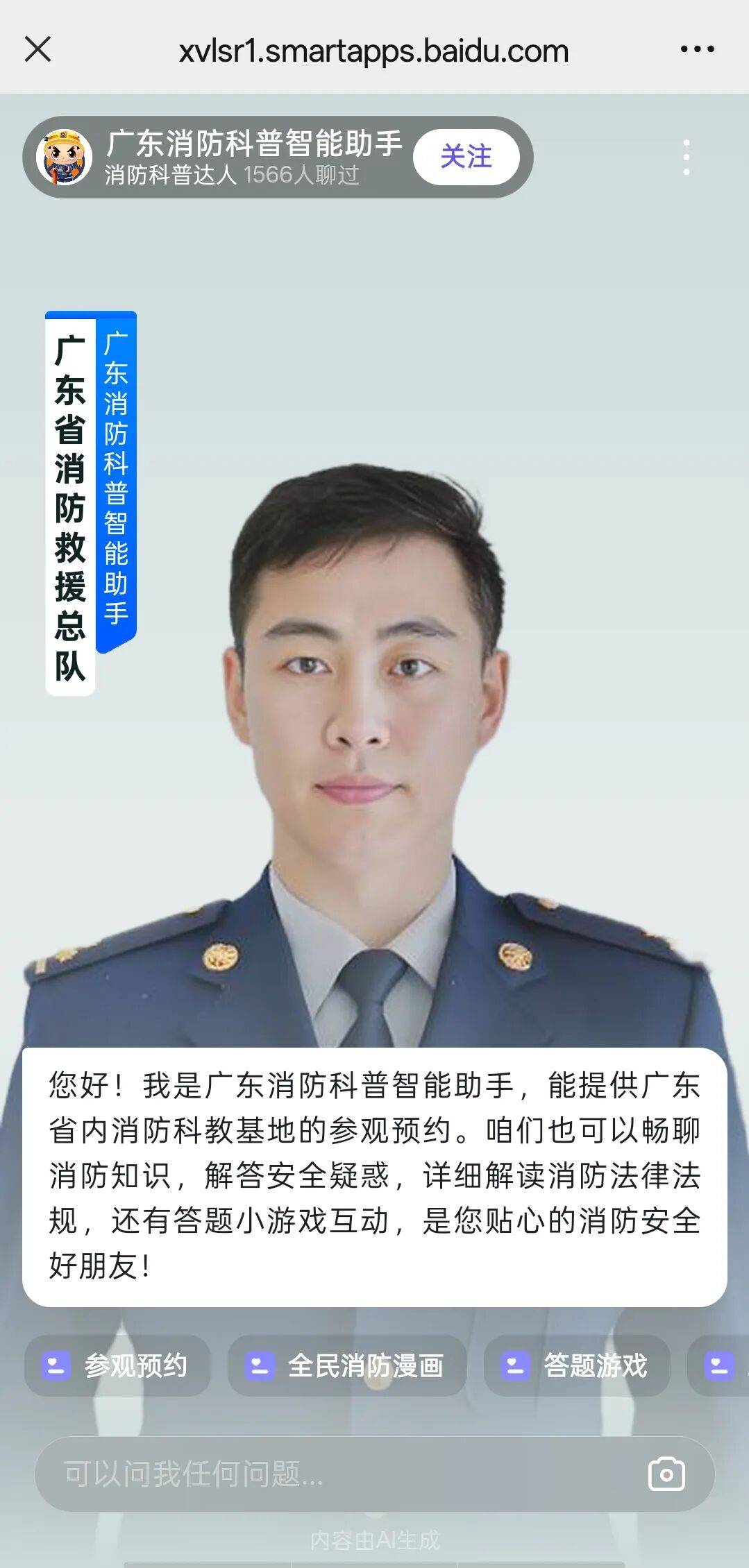 线下,让安全叮咛走进千家万户:我们发动全省284支宣传服务队深入社区,帮助群众查改消防隐患,组织社工、志愿者、网格员等力量在学校、商圈、社区等场所开展活动2.1万场,发放资料256万份,覆盖3500万人次。同步开展消防安全培训与演练7万场,覆盖群众超500万人次,全面提升了群众消防安全意识和自救互救能力。我们还统一规范211个全省消防科普教育基地、消防救援站预约参观流程。创新推出了“广东消防站网上约”功能,并上线AI智能消防科普平台,提供24小时在线问答等服务,结合宣传车穿街走巷巡回宣传,成功构建了“线下实体与线上智能”互补的便民宣传网络。